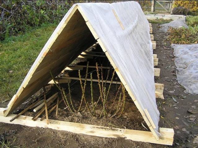 Las rosas sobreviven mejor al invierno en un refugio seco al aire. Se puede preparar a partir de materiales de construcción improvisados: tableros, películas, material para techos. Los materiales de jardín modernos son más prácticos, permiten que la estructura pase el aire y sirven como protección confiable de las plantas contra el clima frío.