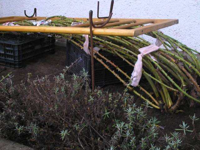 Una de las opciones es cavar las rosas en el invernadero, si el suelo aún no está congelado. Retirar la envoltura de plástico, enderezar las raíces y podarlas si es necesario. Basta con cavar en las ramas 2/3 de la longitud. La tierra alrededor de las plantas está compactada.