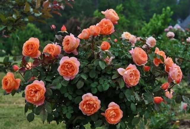 La rosa se utiliza como tenia en el contexto de un césped verde. Un arbusto perenne con hermosas flores de color naranja a menudo se puede encontrar en parques y jardines de rosas.