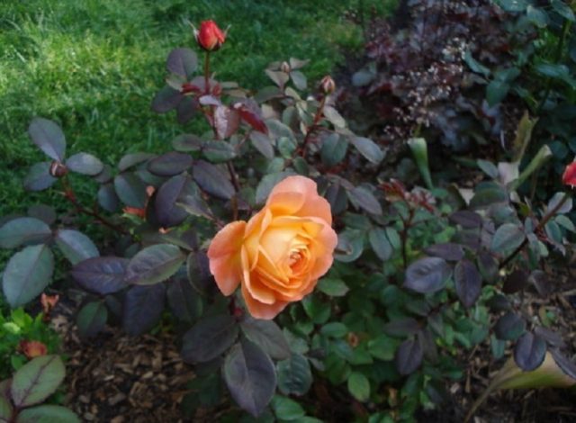 El uso de la rosa de Lady Emma Hamilton en el diseño de paisajes tiene un sinfín de opciones. Esta planta de jardín lucirá elegante tanto en una sola plantación como en combinación con otros cultivos.