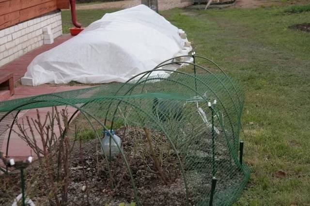 El material de cobertura se coloca sobre los arcos instalados. Lo mejor es usar geotextiles, spunbond, lutrasil en 2-3 capas. El material de cobertura se fija con clips, pinzas para la ropa o clips de plástico especiales. A los lados del refugio se colocan ladrillos o cualquier material y objeto pesado disponible (pedazos de pizarra, molduras, tuberías, piedras).