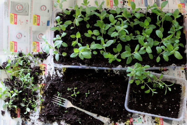 Tan pronto como aparezcan los brotes jóvenes, deben proporcionar una buena iluminación. Después de la formación de 3-4 hojas, se colocan en pequeños recipientes separados. Dos semanas después, regado con una solución de abono mineral. Luego corte la parte superior para mejorar la ramificación.
