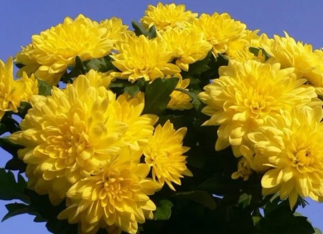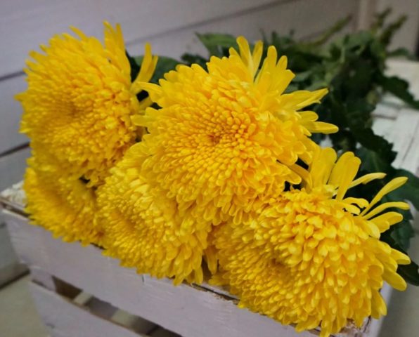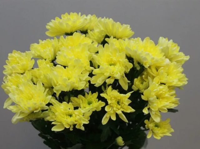 Variedad holandesa de tupidos crisantemos amarillos. Los tallos elásticos y uniformes están cubiertos con un follaje denso, las inflorescencias en forma de canasta tienen un centro de color amarillo verdoso. Los pétalos de las flores tienen la forma correcta de cuchara, enmarcan el centro en tres filas.