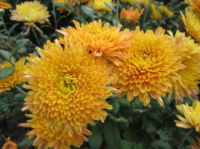 A los jardineros les encanta usar diferentes variedades de arbustos para macizos de flores y parcelas de jardín. Las inflorescencias doradas son exuberantes y vibrantes y se ven bien en grupos pequeños o solas. Una característica distintiva de cada tipo de crisantemo es su maravilloso vecindario. Los arbustos se pueden plantar junto a cualquier planta, encajan armoniosamente en macizos de flores con cultivos de piedra, hiedra, cereales, se ven bien en las cercanías de cultivos de frutas y bayas.