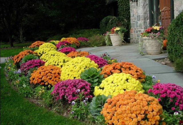 Los crisantemos enanos o de borde se pueden usar para enmarcar el borde del macizo de flores. Los arbustos florecen a finales del verano y florecen hasta la primera helada, y hasta ese momento sirven como seto verde. Los arbustos pequeños en composiciones en macetas también se ven bien.