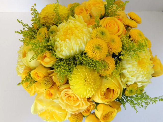 Los floristas experimentados saben cómo hacer un arreglo floral competente para que sea elegante y deleite al destinatario. Los crisantemos amarillos pueden complementar el ramo principal de azucenas, lirios, rosas, claveles, gerberas o alstroemerias. Una hermosa combinación resultará de tonos amarillos con flores burdeos, blancas o lilas.