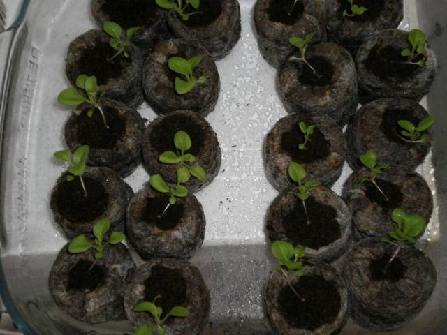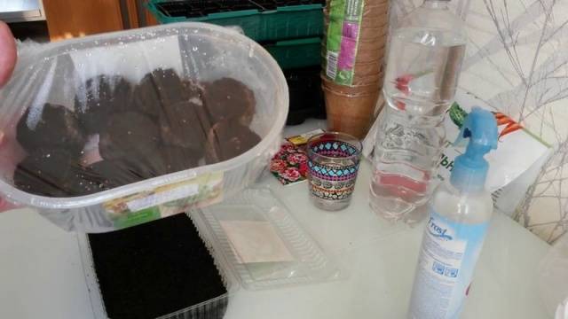 - Si plántulas las petunias se cultivan en tabletas de turba, se colocan previamente en una bandeja de plástico y se vierten con agua. Cuando las tabletas están hinchadas, se puede transferir una semilla de petunia a cada una de ellas.