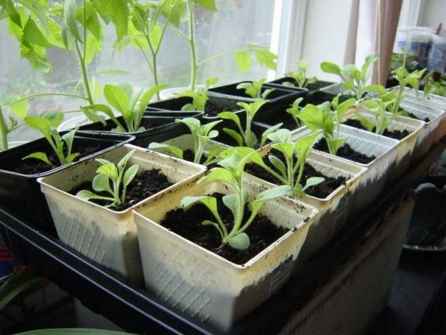Ahora las cajas se cubren con tapas, vidrio o papel de aluminio y se colocan en un lugar muy cálido y luminoso donde la temperatura se mantiene constante a 23-25 grados. Si es necesario, debe usar de inmediato la iluminación de un fitolamp o una lámpara fluorescente simple.
