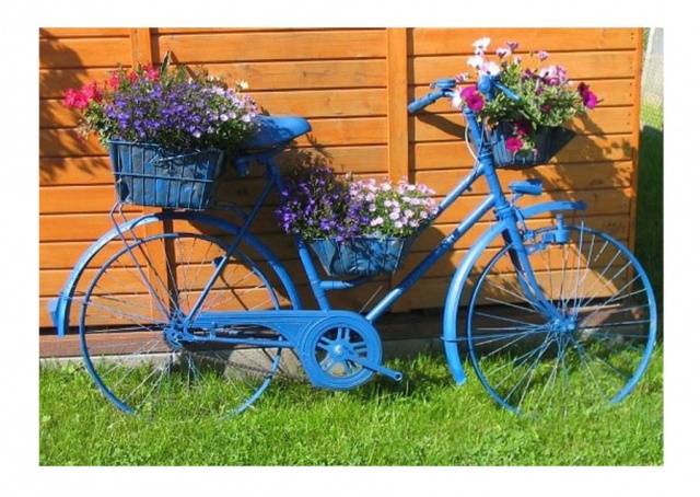 - Materiales a mano... En principio, cualquier objeto que se haya vuelto obsoleto puede encontrar una nueva vida, convirtiéndose en un recipiente para una flor. Las macetas de jardín para plantas de bricolaje son fáciles de hacer. Las ideas más atrevidas encontrarán encarnación en su trama personal. Un viejo carro de jardín, barriles, cestas, llantas de automóvil, incluso botellas de plástico: todo entra en el negocio del propietario entusiasta. En la foto hay macetas originales de una vieja bicicleta.