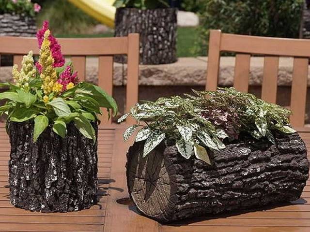 - Madera... Material no demasiado duradero, una maceta de madera para plantas definitivamente entrará en contacto con la humedad. El árbol requerirá protección adicional contra la descomposición, luego durará más de un año.El uso de tocones de árboles no es una idea nueva, pero no deja de ser original. En el tocón o corte de sierra de un árbol, la parte interior está ahuecada. Se hacen orificios de drenaje, el árbol se trata con un antiséptico. Y como resultado, tenemos macetas no estándar hechas por nuestras propias manos. Lo mejor es llenar con tierra no el muñón en sí, sino algún recipiente y ponerlo dentro de la ranura.