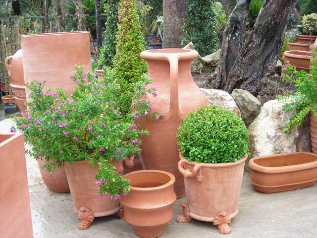 - Cerámica... Material natural. Mira orgánicamente en el paisaje. Pero muy frágil. Puede hacer macetas para flores con sus propias manos, pero se requiere cocción para que el producto dure mucho tiempo.