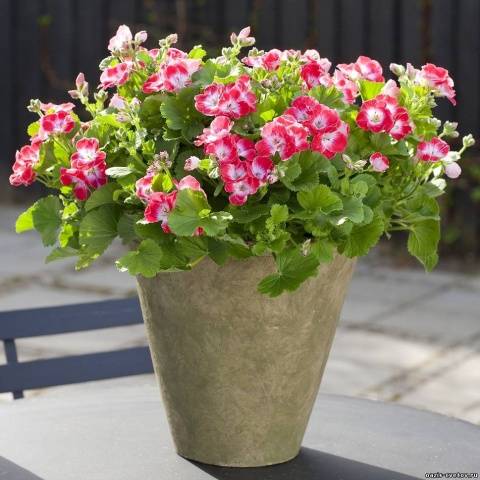 - Geranio muy hermosa en flor, las flores tienen una variedad de colores. El arbusto de geranio se deleitará con flores durante toda la temporada. Puede propagarse por esquejes y semillas;