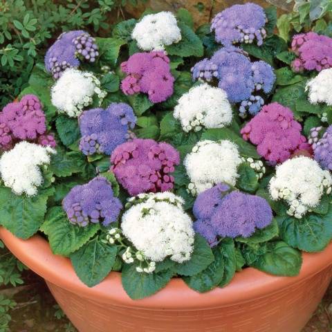 - Ageratum... Las flores son como suaves pompones que caen sobre todo el arbusto. Colorear de blanco a azul. Florece profusamente durante toda la temporada. La planta exige una buena iluminación.