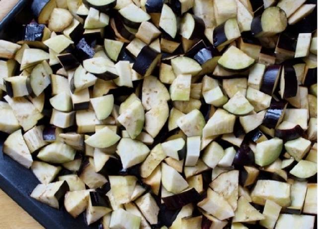Lave la berenjena, no pele la piel, córtela en trozos de no más de 5 mm de tamaño.