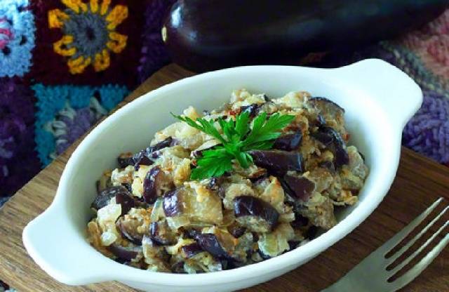- Prepare las berenjenas: pele, corte, vierta sobre huevos batidos, insista. Saltee con cebollas, agregue crema agria, hierbas y especias, cocine a fuego lento hasta que estén tiernas.
