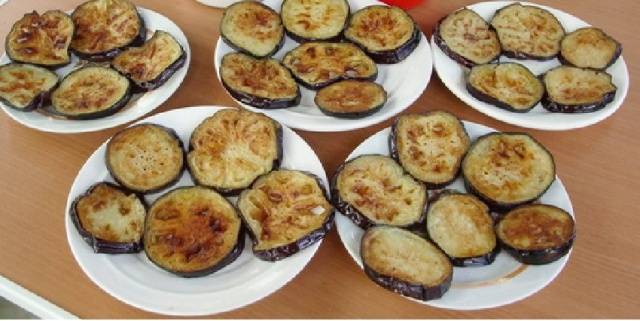 Precalentar una sartén, verter la mitad del aceite (3 cucharadas), freír la berenjena por ambos lados. Es necesario freír las berenjenas "como champiñones" hasta que aparezcan doradas, tarda unos 3 minutos. Colocar en un plato para que se enfríe.