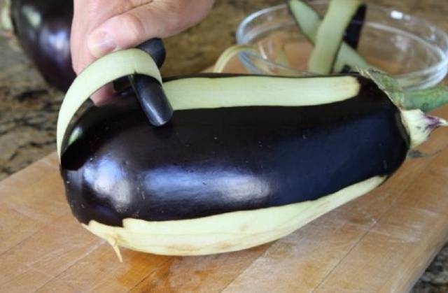 - Requisitos de prescripción. Otro matiz para el especialista culinario es qué tipo de procesamiento se requiere según la receta. Para las rodajas fritas o a la parrilla, no es necesario cortar la piel. Ayudará a que la berenjena mantenga su forma. Si quieres freír los cubos en pan rallado o para guisos, pelar la corteza no te hará daño.