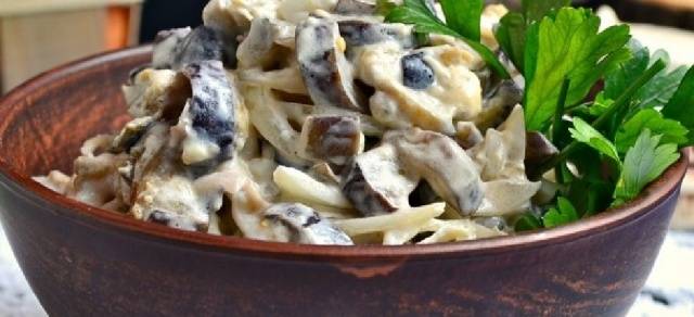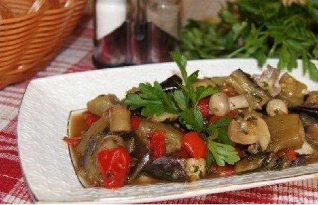 La preparación de esta opción es casi la misma que la receta anterior. Debe preparar verduras, huevos, mayonesa o crema agria, hierbas, especias y aceite vegetal. Las berenjenas se preparan como de costumbre: se lavan, se sala, el jugo se escurre, se mezcla con huevos, se insiste y se fríe. Luego se saltean las cebollas, se combinan con las berenjenas, se continúan friendo. Al final, agregue un cubo de champiñones, crema agria, hierbas y especias.