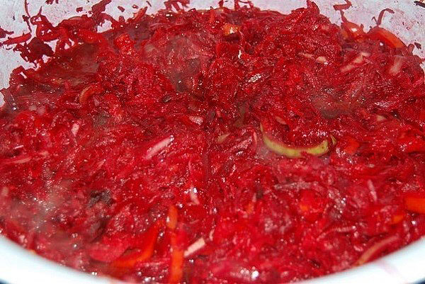 Se aconseja utilizar dicha conservación para el almuerzo, pero también se consume como refrigerio frío. Los productos que necesitas son los más sencillos: 2 kg de remolacha, 1 kg de tomate, cebolla y zanahoria, la mitad del tamaño de pimiento. Y también necesitarás un vaso de cualquier aceite, de girasol u oliva, al gusto de la anfitriona, 130 ml de vinagre al 9%, 200 gramos de azúcar granulada y la mitad de la cantidad de sal de mesa.