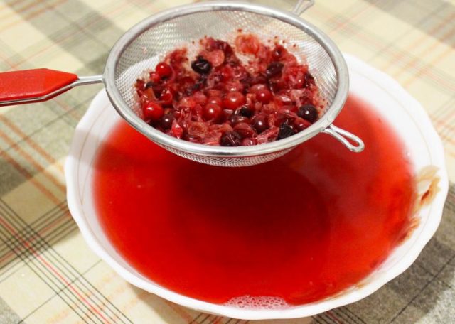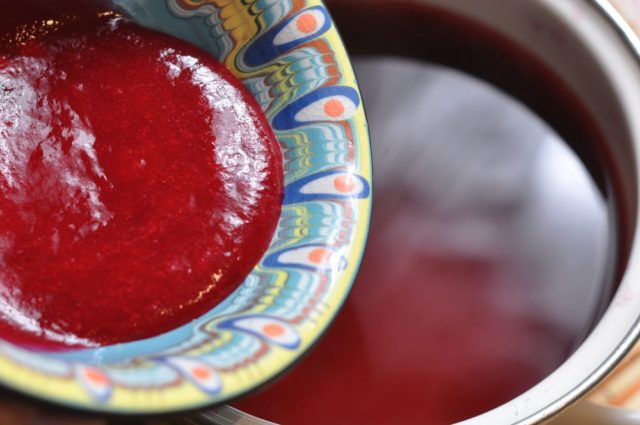 - Cuele las bayas y vuelva a poner el caldo resultante en la estufa, caliéntelo e introduzca lentamente el almidón en la masa.