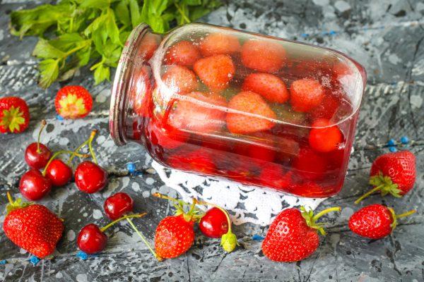 Compota de fresa para el invierno con la adición de cerezas o cerezas.