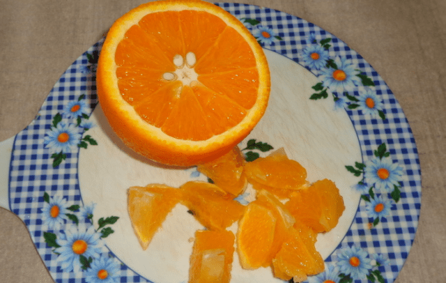 - Retire la cáscara de la naranja, divídala en gajos. Retire la película blanca y los huesos. Corta la pulpa en trozos.