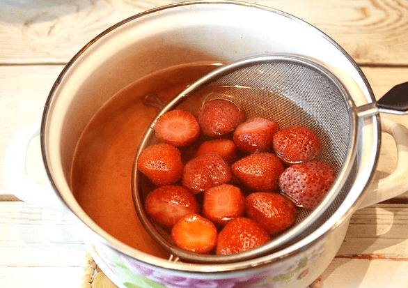 - Hervir unos 2 litros de agua. Coloque las fresas lavadas sin tallos y las hojas de menta en un colador o colador. Escaldarlo en agua hirviendo durante 40-60 segundos. Deje enfriar durante aproximadamente un minuto. Repita 3-4 veces más.