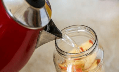 - Hervir unos 2,5 litros de agua, verter en un recipiente debajo del cuello, enrollar la tapa.