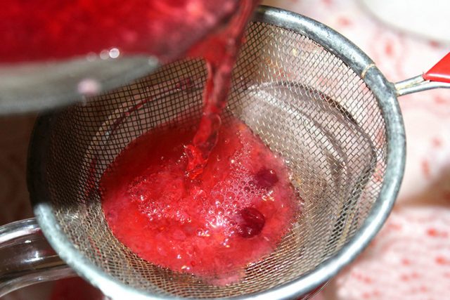 - Usando un colador de plástico o varias capas de gasa, filtre la papilla, exprimiendo el jugo de arándano en un recipiente aparte.