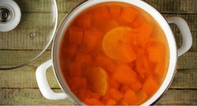 Agregue las rodajas de naranja a la calabaza hervida, revuelva y cocine por otros 5 minutos.