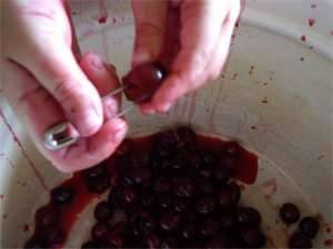 - Los huesos se eliminan de las cerezas. Si no hay una máquina especial, puede hacerlo con un mango de cucharadita o una horquilla.