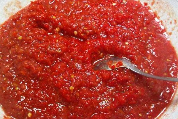 - Enviamos el pimiento y los tomates a la picadora de carne. Antes de eso, se debe escaldar ligeramente con agua hirviendo.Ponemos la masa resultante en la estufa y cocinamos durante 5 minutos.