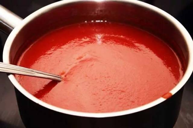 - Para esto, los tomates se lavan, se pelan, se pican con una picadora de carne o licuadora. Y lo pusieron a cocinar.Tiempo de 30 a 60 minutos, dependiendo de la jugosidad del tomate. Para obtener 2 litros de puré de tomate, tome unos 5 kg de tomates. El tiempo de cocción depende del grosor que desee obtener. En esta receta, es mejor hervir el puré lo más espeso posible.