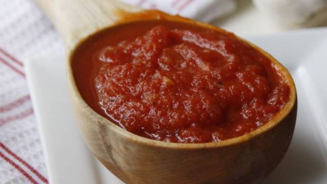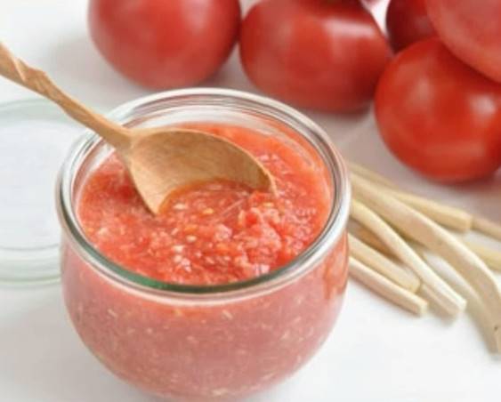 La receta le permite guardar la cosecha de tomate para el invierno. Dependiendo de la densidad, la preparación puede ser tanto un condimento como un plato completo para bocadillos y bocadillos.