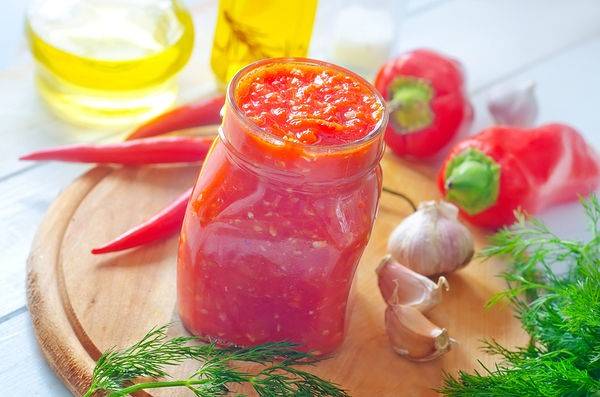 La adjika hecha de tomate y pimiento tiene un sabor más suave que su contraparte abjasia. Vendrá por cierto para los segundos platos de arroz, patatas, pasta, carnes y aves.