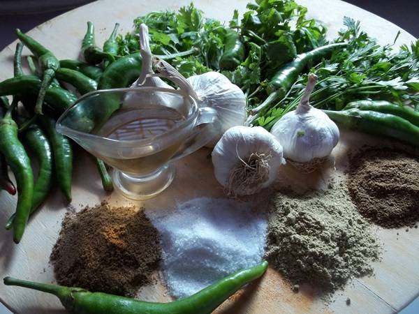 Pelar, lavar, moler el pimiento picante en una picadora de carne, picar el ajo, agregar junto con el aceite de girasol a adjika.