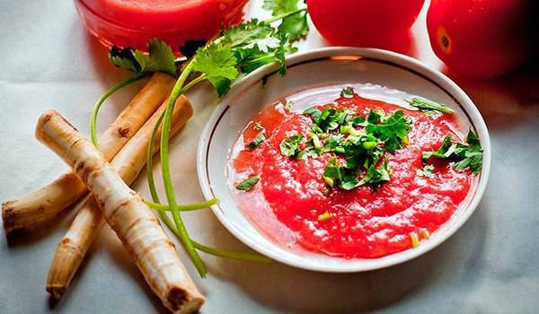 Para 2 kg de tomates maduros, agregue 500 g de zanahorias, 200 g de rábano picante y 4 pimientos de tamaño mediano. Ajo en la cantidad de 200 g, una cucharadita de pimentón y 2-3 chiles agregarán la especia necesaria a la salsa. Además, la receta implica el uso de 70 ml de vinagre, unas cucharadas de azúcar. La albahaca es la hierba recomendada.