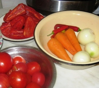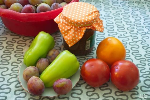 Para cocinar, necesita 3 kg de tomates maduros y carnosos, pimientos, cebollas, ciruelas y zanahorias (500 g de cada uno de los ingredientes enumerados). También utilizan 200 g de ajo, pimientos picantes (10 vainas), 100 g de azúcar y 2 cucharadas. l. sal. Para todo el volumen de comida durante el guisado, será necesario agregar 500 ml de aceite vegetal.