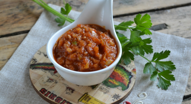 La adjika con cebolla preparada según esta receta se puede encontrar a veces acompañada del comentario “¡Te lamerás los dedos!”. Para entender que esto es realmente así, debes intentar cocinarlo.