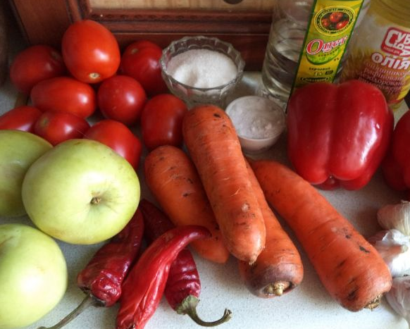 Antes de comenzar a cocinar, debe abastecerse de un conjunto de alimentos esenciales. Entonces, en la preparación de adzhika, necesitará tomates en la cantidad de 2.5 kg, zanahorias y pimientos 500 g cada uno, 300 g de cebollas, 200 g de ajo, 3 pimientos amargos. Además de los productos principales, necesitarás 250 ml de aceite y la misma cantidad de vinagre al 6%, un vaso de azúcar, 1/4 taza de sal. Si se ensambla un conjunto de productos de este tipo, puede comenzar a cocinar adjika.