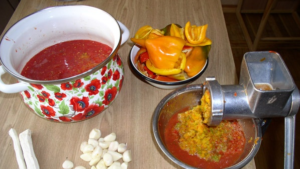 - Todas las verduras, a excepción de las cebollas, se lavan, pelan y cortan con una picadora de carne. Una característica de la receta es la facilidad de procesamiento de los productos. Entonces, por ejemplo, los granos no deben eliminarse del interior de los pimientos amargos y morrones. Se cree que añaden un toque extra de picante al plato terminado.