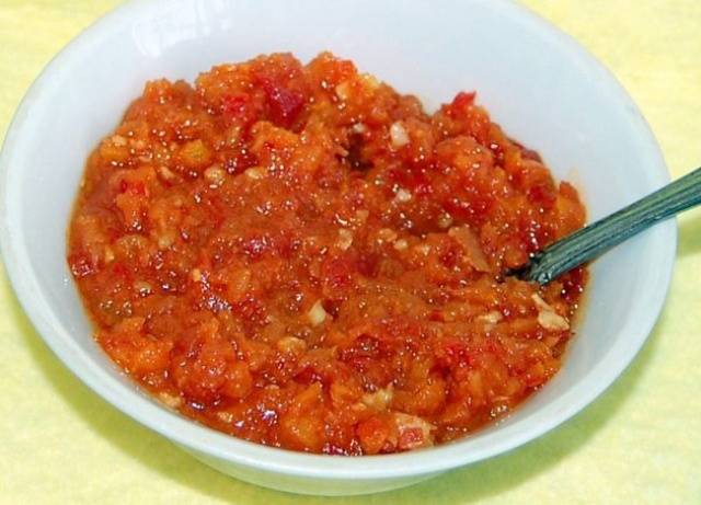 - Sirva la adjika lista en la mesa como condimento para varios platos de verduras, pescado y carne.