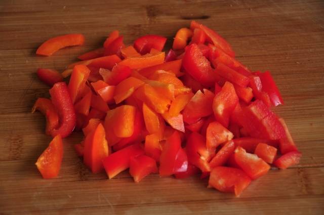 - Los pimientos picantes (0,2 kg) se limpian de semillas y tallos. Se realizan acciones similares con pimiento morrón, que requerirá 0,5 kg.