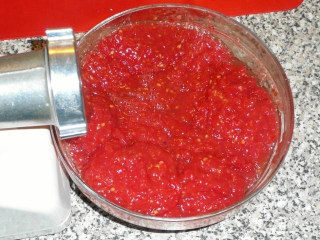 - Los pimientos, las zanahorias y los tomates rojos se cortan en una picadora de carne.