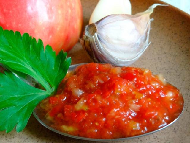 La receta de cocina es simple, la más popular, ya que se prepara a partir de productos simples disponibles y no requiere una preparación compleja. Dicha adjika se puede utilizar como salsa preparada para platos principales o se puede agregar a sopas y guisos.