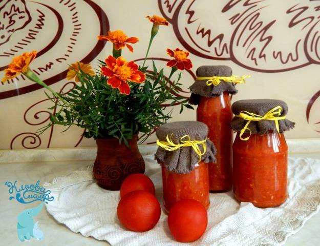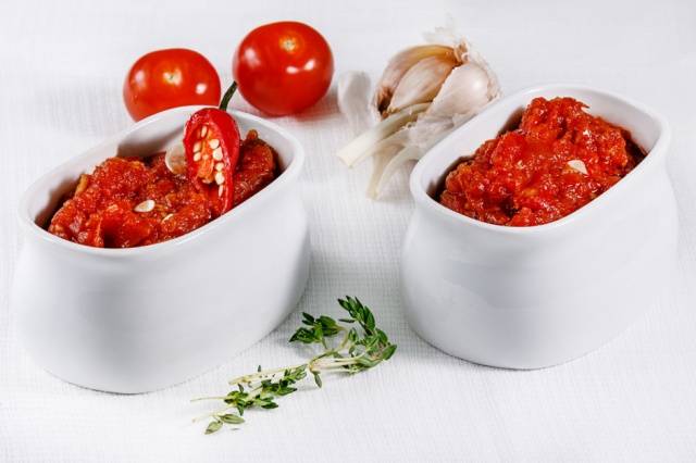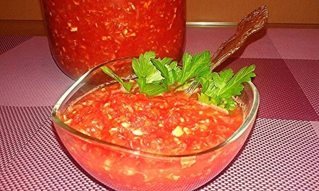 La receta clásica de una deliciosa adjika. preparado sobre la base jugo de tomatepor lo tanto, tanto los tomates frescos como el jugo de tomate listo para usar se pueden utilizar como ingrediente principal.