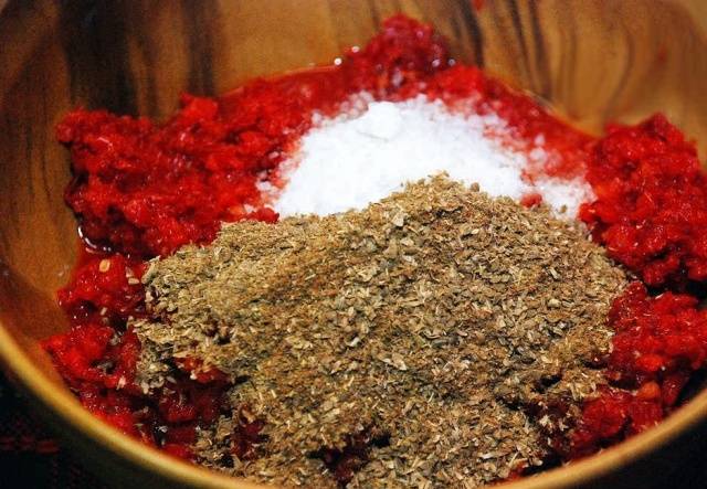 Se agregan vinagre, azúcar y sal a las verduras y hierbas molidas, todo se mezcla bien, se coloca en frascos estériles y se envía al refrigerador.