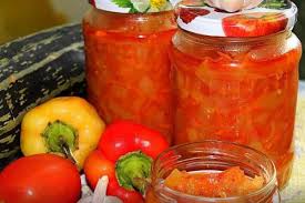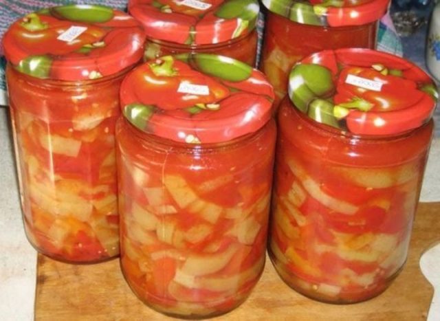 - Agrega tiras de pimiento dulce. Después de veinte minutos de guisado, sazone con vinagre. Cocine por 5 minutos. El producto ya está listo para ser empaquetado y enrollado.