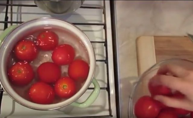 - Mientras tanto, pelar los tomates, cortarlos en rodajas.¡Consejo! La forma más fácil de cocinar es remojar en agua hirviendo durante un minuto y luego enfriar muy rápidamente en agua fría.