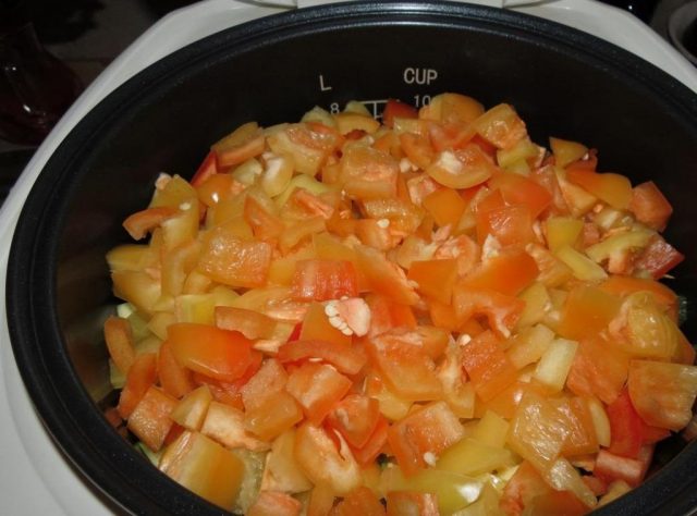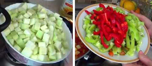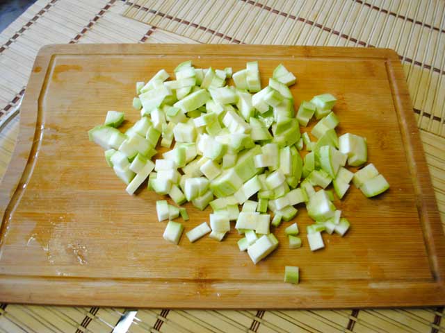 - todas las verduras, excepto los pimientos, que se cortan mejor en tiras, se cortan en cubos.